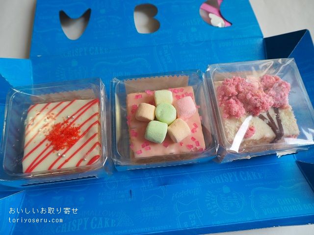 岩おこしのお店「あみだ池大黒」が手がける日本初のライスクリスピートリート専門店 「マシュー&クリスピー」より春の季節限定のお菓子をお取り寄せしました。 お米のシリアルを、マシュマロで固めたふんわりサクサクの生地の上に、チョコレートなどでデコレーションを行った、新食感スイーツです。アメリカの気軽なおやつの定番、マシュマロ&ライスクリスピーをアレンジしたお菓子。ポップなデザインと色合いが人気。