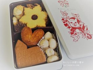 缶の中にはパルミエ(ハート型のパイ)、チョコクッキー、お花型のサブレ、ブール・ド・ネイジュ、クロッカン、ハート型のクッキーの6種入り。