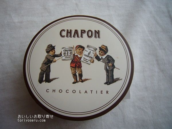 サロンデュショコラでも2007年、2011年、2016年と3度賞を受賞しています。このチョコはお店で購入したものですが、パッケージデザインがめちゃくちゃ可愛い。いろいろあった中で、小さい丸ボックスを購入しました。ボックスの大きさは直径6.8cm×深さ2cmほど。CHAPONの文字と男の子が3人描かれているレトロなデザイン。