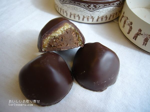 側面にもこの男の子たちがぐるりと描かれています。中には、サロン・ド・ショコラパリ受賞のスモークソルトを入れたプラリネが3個はいっています。食べると中のプラリネにはヘーゼルナッツが効いてて、外側の白い部分がスモークソルトの入ったキャラメルみたいになってます。その上からビターチョコでコーティングされています。キャラメリゼした部分がじゃりじゃりっとした食感で、ぴりっとお塩が効いてて、ヘーゼルナッツがとても香ばしいです。