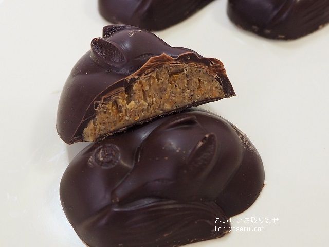 くるっと丸まったキツネの形のチョコレートの中に入っているジャンドゥーヤタイプのプラリネは、ほんのり塩味。キャラメルとナッツクランチがシャリシャリプチッ! ダークチョコでカバーしてかわいいキツネになりました。味は極力甘さをおさえた大人テイスト。
