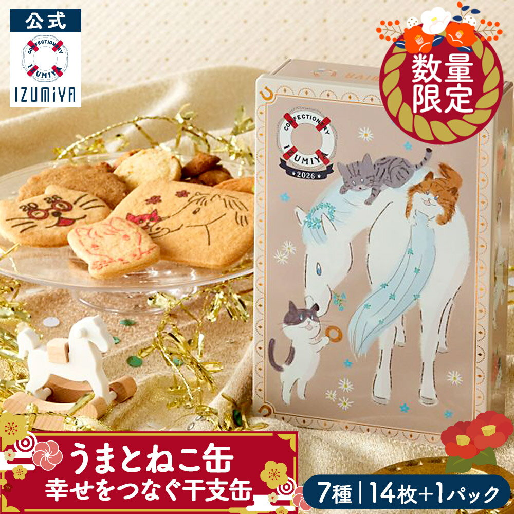 毎年発売される泉屋東京の干支モチーフのクッキー缶。とっても人気で早々に売り切れる年もあるほどに人気のあるクッキー缶です。2026年の干支、午(うま)をデザインした缶入りクッキー、泉屋人気のリングターツ可愛らしプリントクッキーが入った詰め合わせです。プリントクッキーの他、4種のクッキー、ミニ絵本、可愛いぽち袋が詰めあわされています。