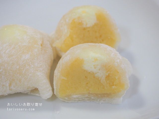 ふわっふわもちもちの「求肥」で包んだスイートポテト大福。求肥の中は、 北海道厚沢部町産の「さつまいも」と 函館産の「牛乳」を使った濃厚でなめらかなスイートポテトクリームに 甘さ控えめな「生クリーム」がトッピングされてます。