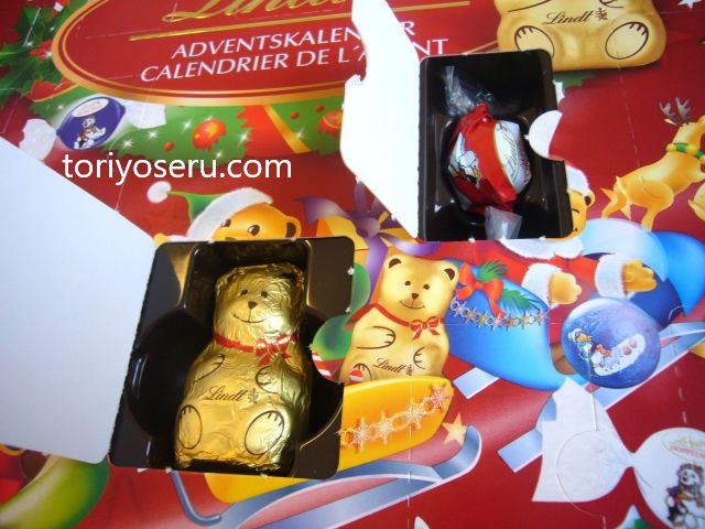 箱の上の部分に日付の数字が書かれていて、12月1日から24日まで毎日いっこづつ開ける仕様となってます。くまさん型のチョコやクリスマス包みの小さいリンドールチョコなど。毎日異なるチョコレートが出てくるもの楽しみの一つ。