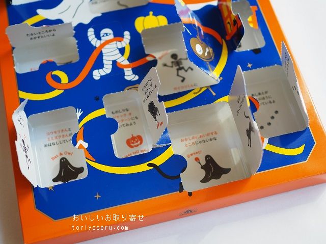 チョコレート×8個、クランチチョコレート(ミルク)×2個、キャンディ×6個、チョコレートクッキー×2個、バタークッキー×2個入り。それぞれハロウィン仕様のパッケージが可愛い。