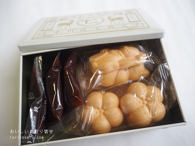 縁起物の鯛、梅、瓢箪、招き猫をかたどった最中。自分で餡をはさむ手作りタイプのため、餡と最中は別々に入ってます。食べたいときに餡をしぼって最中にいれていただきます。作りたてはパリパリとした食感が楽しめます。