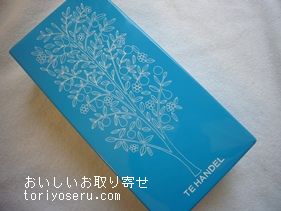 鮮やかなブルーの缶に白い文字。すごく爽やかなすてきな缶です。サイズは22.5cm×13.5cm×深さ6cm。職人さんの手作業で作られているそうで、缶の端っこの縁取りなどが味わいがあって、すごく良いです。以前に取り寄せたTEHANDELテイスティングセットやカフェタナカのサブレ缶などとよく似た手作りの缶です。