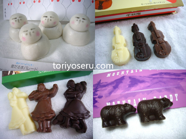 こちらは、可愛い形のお菓子。千秋庵さんの懐かしのお菓子たち。今は販売されていないものも。。。バイオリンチョコレート、ダンスパーティー(チョコ)、マウンテンダディ(くまチョコ)、雪だるまパレード。また再販してほしいくらい可愛い。