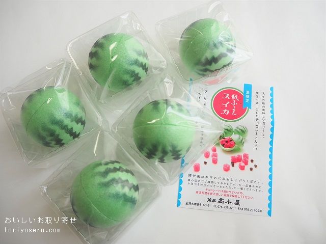石川県金沢市にある和菓子屋さん菓匠 高木屋さんの夏の和菓子「スイカの紙ふうせん」と「うちわせんべい」です。大正14年創業の老舗の和菓子屋さん。「紙ふうせん」「あんず餅」「あんずパイ」「加賀大納言パイ」などの和菓子が人気。取り寄せたのは夏限定の和菓子。まん丸のスイカ模様の最中の中にはスイカゼリーとスイカの種をモチーフにしたチョコレート入り。