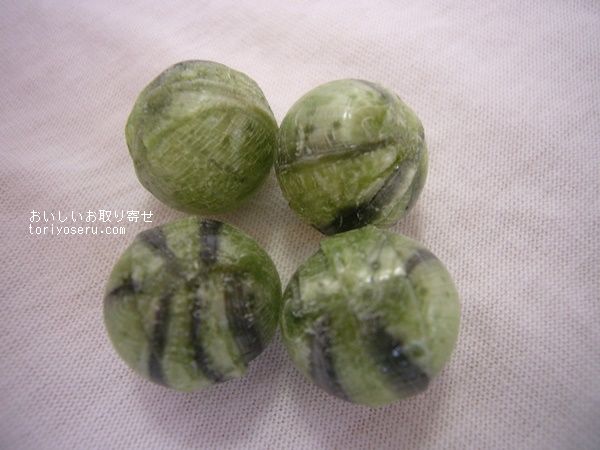 中身は、これまたスイカそっくりな真ん丸キャンディが入ってます。キャンディーにもすいか模様がデザインされていて、実際食べるとスイカの味がします。スイカ果汁が使われているそうで、塩すいか味。
